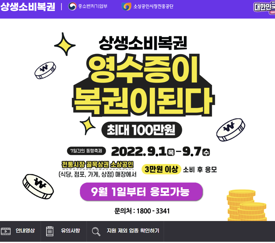 중소벤처기업부에서 9월1일 부터 9월 7일 까지 전국민을 대상으로 영수증을 추첨방식으로 하여 ' 상생소비복권' 이벤트를 진행한다고 합니다. 상생소비복권 홈페이지에서 확인 가능합니다!! 아