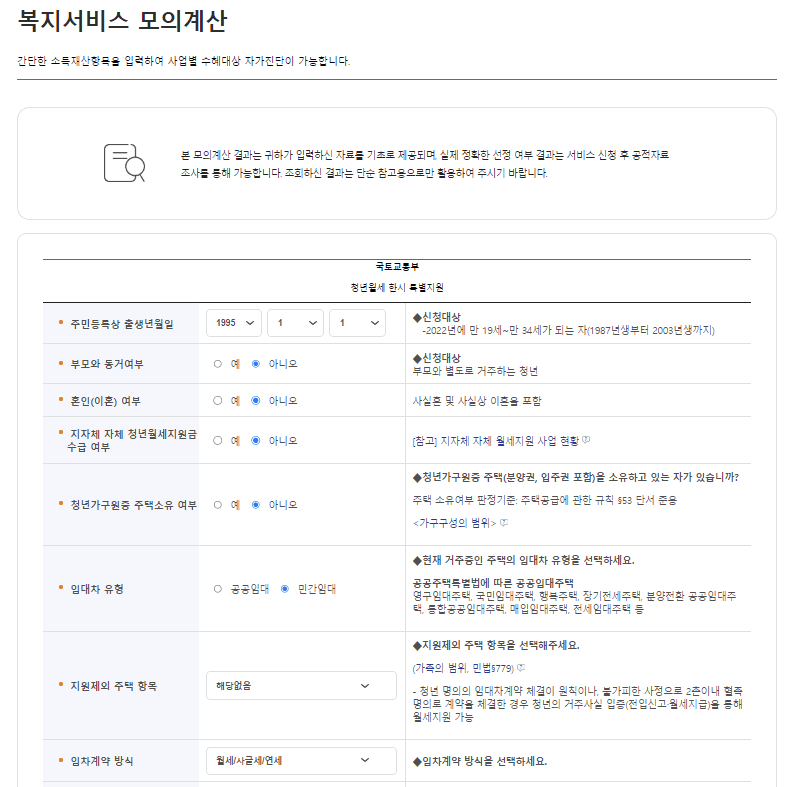 ( 출처 : 복지로 공식 홈페이지 / 복지서비스 / 모의계산 / 청년 월세 지원 )